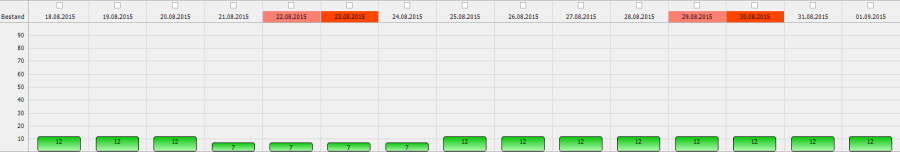 Es ist auf einen Blick ersichtlich, dass die 10 Stück im Zeitraum 21.08. – 24.08. nicht verfügbar sind – sehr wohl aber an den anderen Tagen, oder in der Menge 7.