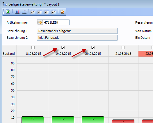 Zur Kundenbeauskunftung geben Sie einfach die gewünschte Reservierungsmenge in das Feld Reservierungsmenge im Abfragebereich ein. Sollte der verfügbare Bestand zu einem Zeitpunkt nicht ausreichend sein um die Reservierungsmenge abzudecken, werden die entsprechenden Tage rot eingefärbt.