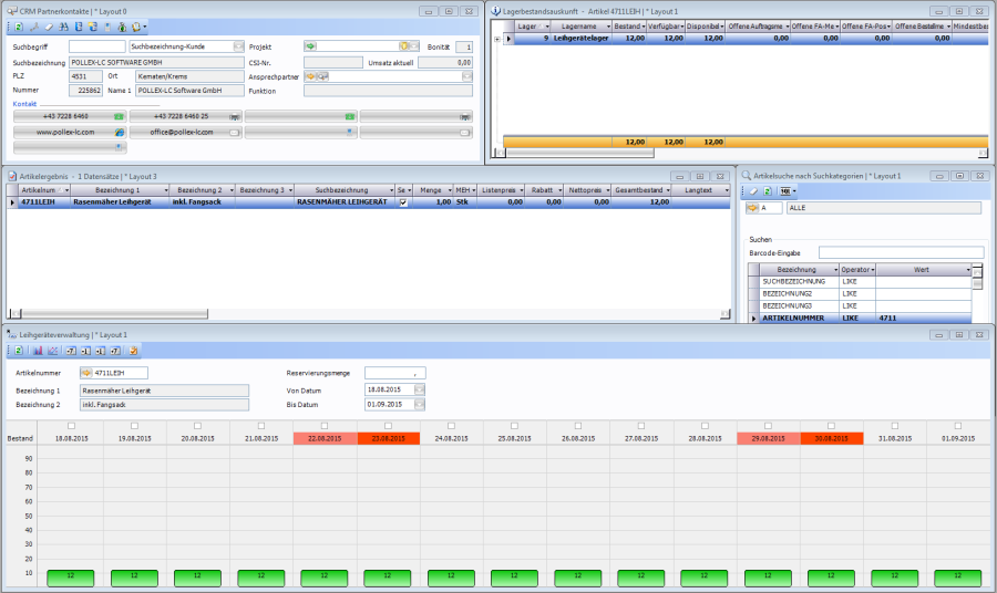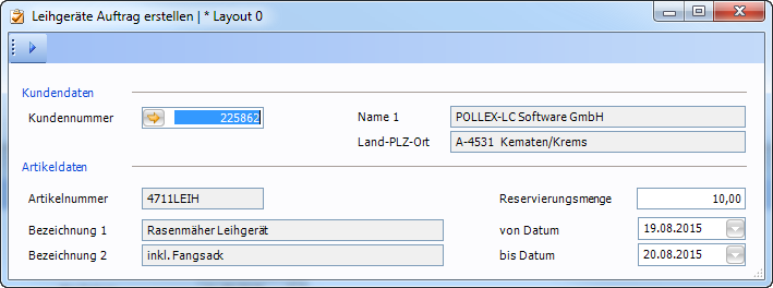 | Auftrag erstellen | Erstellt einen Leihgeräteauftrag für den gewählten Kunden und Artikel im gewählten Zeitraum |