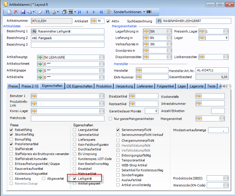 Um einen Artikel als „Leihgerät" zu definieren, muss im Artikelstamm die Eigenschaft „Leihgerät" aktiviert sein.