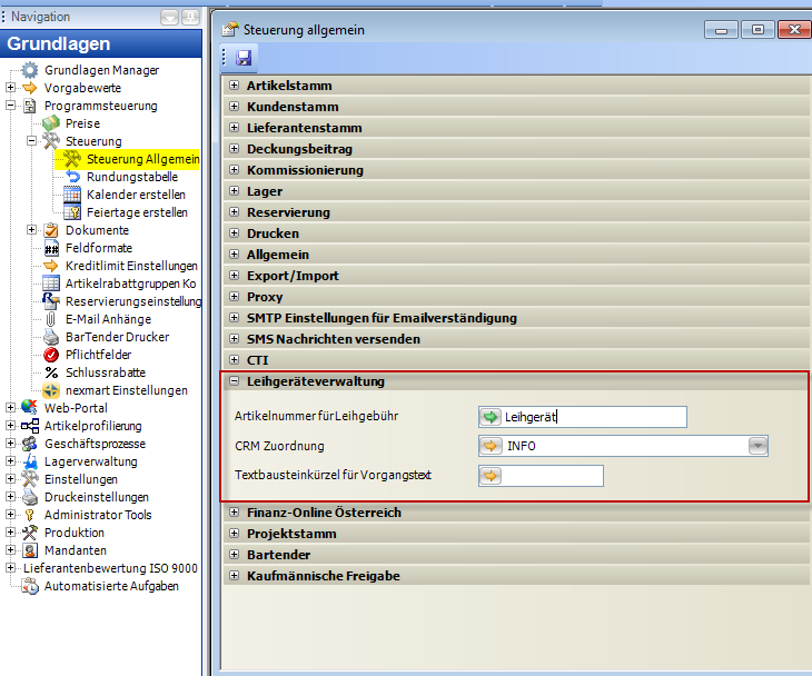 In Leihgeräteaufträgen kann automatisch eine Leihgerätegebühr eingetragen werden. Die Artikelnummer für die Leihgerätegebühr wird im Feld „Artikelnummer für Leihgebühr" hinterlegt.