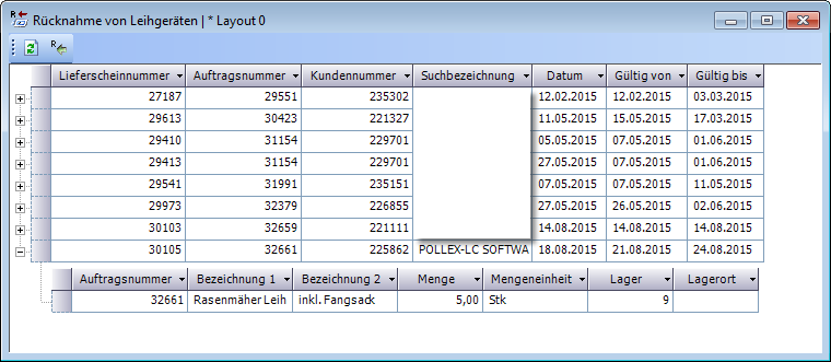 Die Leihgeräte können nun in den Positionen wie normale Auftragspositionen erfasst werden. Die Dauer des Leihvorgangs wird in den Felder „Gültig von" und „Gültig bis" eingetragen. Nur wenn diese Felder befüllt sind, kann eine korrekte Anzeige des Bestandsverlaufs im Diagramm erfolgen. Die Befüllung erfolgt automatisch, wenn der Leihgeräteauftrag über das Fenster „Leihgeräteverwaltung" erstellt wurde.