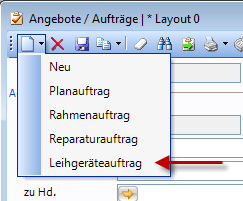 Alternativ dazu kann ein Leihgeräteauftrag auch manuell über das Fenster Angebote/Aufträge erstellt werden. Dazu wird im Fenster Angebote/Aufträge erfassen das Symbol „Neu" aufgeklappt und der Punkt „Leihgeräteauftrag" wird gewählt: