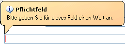 Wenn beim Speichern in einem Pflichtfeld noch keine Eingabe besteht, wird folgende Systemmeldung direkt beim Pflichtfeld, bei dem die Eingabe fehlt, angezeigt. Die Systemmeldung wird nach einigen Sekunden von selbst geschlossen.