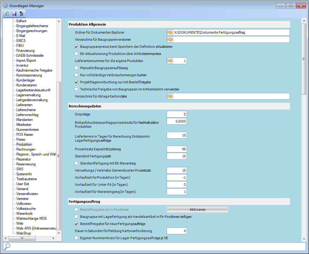 In den Grundlagen stehen nachfolgend beschriebene Dialogfenster zu Verfügung, in denen Einstellungen zur Programmsteuerung getroffen bzw. Stammdaten und Vorgabewerte für die Produktion verwaltet werden können.