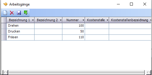 | [ Enter ] | Übernehmen | Das Symbol ist nur aktiv, wenn Arbeitsgänge als modales Dialogfenster geöffnet wurde. Mit Übernehmen wird der ausgewählte Arbeitsgang in jenes Feld übernommen, aus dem Arbeitsgänge geöffnet wurde. |