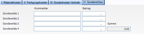 = Manuelle Eingaben im Fenster Nachkalkulation auf der Registerkarte IV. Sondererlöse (Sondererlös 1 bis 4)
