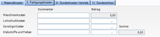 = Manuelle Eingaben im Fenster Nachkalkulation auf der Registerkarte II. Fertigungskosten (z.B. Lohndruckkosten, Sonstige Kosten, Klebstoffe und Farben)