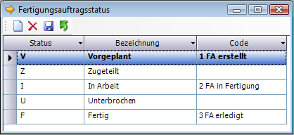 Code | Aus dem Listfeld von Code kann ein Funktionscode ausgewählt werden. Wenn bei der Bearbeitung von Fertigungsaufträgen der dem Funktionscode zugehörende Auslöser ausgeführt wird, wird dem Fertigungsauftrag der entsprechende Fertigungsauftragsstatus durch das Programm zugewiesen. Mögliche Funktionscodes (Systemvorgabewerte): Funktionscode: 1 FA erstellt Funktionscode: 2 FA in Fertigung Funktionscode: 3 FA erledigt |