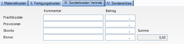 = Manuelle Eingaben im Fenster Nachkalkulation auf der Registerkarte III. Sonderkosten Vertrieb (z.B. Frachtkosten, Provisionen, Skonto, Bonus)