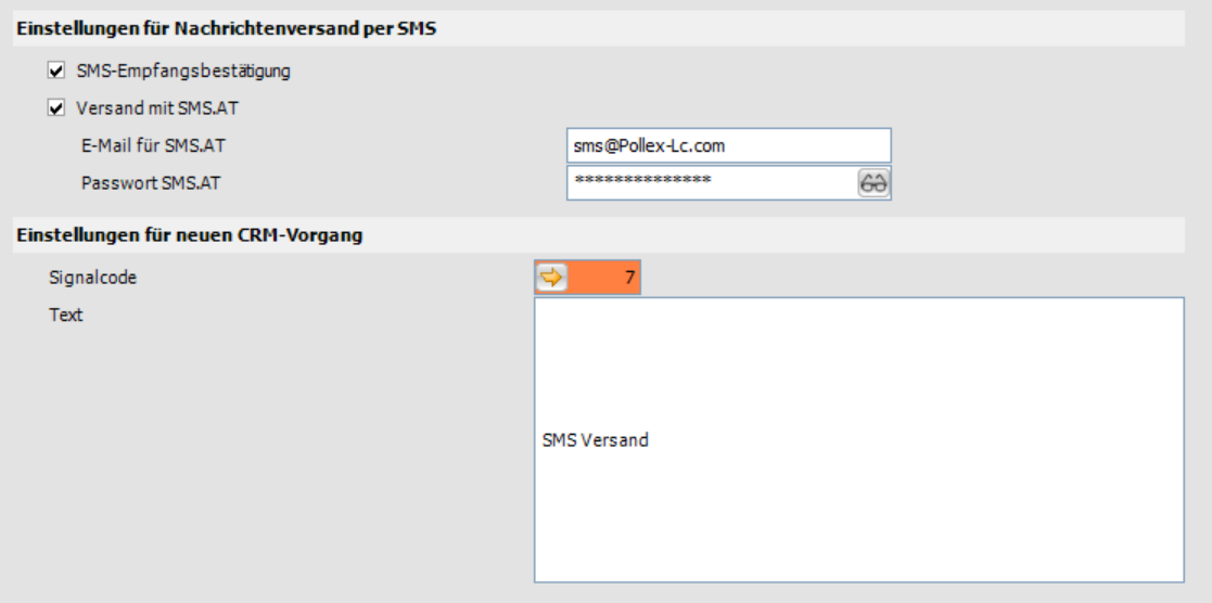 Nach dem Versenden der SMS durch SMS.AT wird an die in Grundlagen eingetragene E-Mailadresse eine Sendebestätigung geschickt. Beim SMS-Versand aus den Programmteilen Lieferscheine und Lieferkontrolle wird zusätzlich ein CRM-Vorgang zum Kunden angelegt. Der Signalcode für diesen Vorgang kann in Grundlagen eingestellt werden.