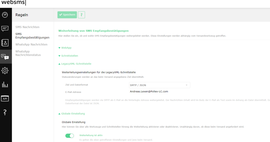 Damit man eine Mail bekommt, muss unter Regeln bei SMS Empfangsbestätigung in LegacyXML-Schnittstelle eine Mailadresse hinterlegt werden. Ebenso muss bei Globale Einstellung, der Haken Weiterleitung aktiv gesetzt sein.