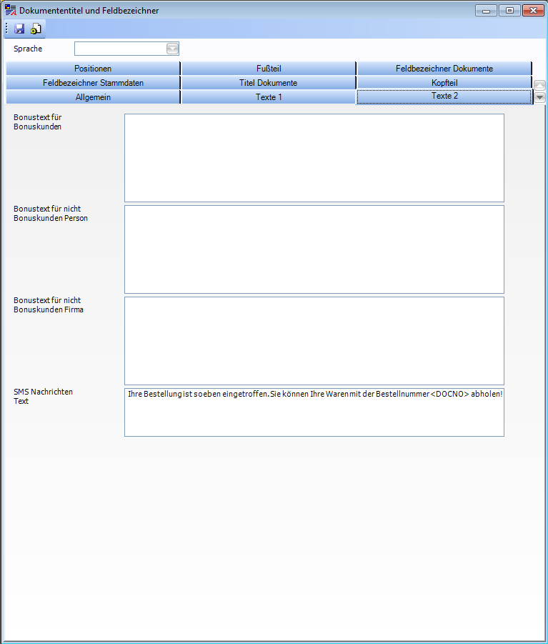 Unter Grundlagen / Programmsteuerung / Dokumente /Dokumententitel / Text2 wird der Text für die SMS Benachrichtigung aus den Programmteilen Lieferscheine und Lieferkontrolle eingetragen.