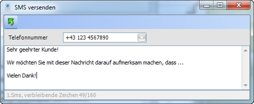 Der Text der Nachricht ist der unter Grundlagen / Programmsteuerung / Dokumente / Dokumententitel / Texte 2 / SMS Nachrichten Text eingetragene Text.