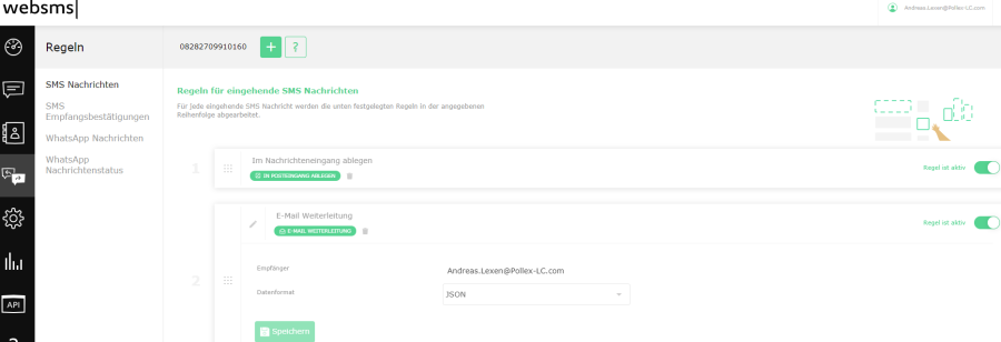 Damit man sieht, ob ein Kunde eine Antwort auf die SMS sendet, muss man unter Regeln bei SMS Nachrichten in Neue E-Mail Weiterleitung eine Mailadresse hinterlegen.
