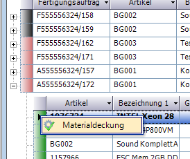Aus der Tabelle Materialdeckung wird bei Selektion einer Zeile die Artikelnummer an andere Fenster übergeben. Das Fenster „Materialdeckung Position", welches den Bestandsverlauf eines Artikels anzeigt, kann auch mit dem Kontextmenü geöffnet werden.