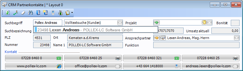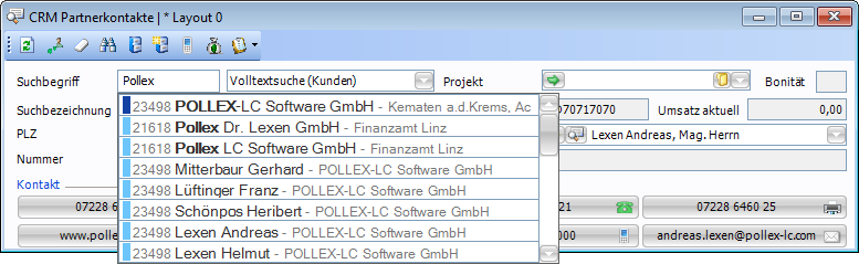 Die Verwendung wird am Beispiel des Fensters CRM Partnerkontakt dargestellt. Durch die Eingabe im entsprechenden Textfeld wird die Vorschlagsliste angezeigt (siehe Abbildung unterhalb). Darin werden die Ergebnisse mit den meisten Übereinstimmungen aktiver Kunden und Ansprechpartner absteigend sortiert angezeigt. Die Nummer zu Beginn jedes Eintrags entspricht immer der Kundennummer.