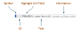 Die Vorschlagsliste wird unterhalb des Eingabefelds der Volltextsuche angezeigt. Sie beinhaltet die gefunden Treffer in absteigend sortierter Reihenfolge, beginnend mit dem besten Treffer. Die Einträge in der Liste können von verschiedenen Suchindizes stammen und sind daher farblich markiert. In der Abbildung unterhalb ist die Unterteilung eines Eintrags der Vorschlagsliste dargestellt.