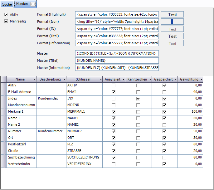 Analysiert | Gibt an, ob das Suchfeld bei der Suche berücksichtigt wird. Dient ein Feld nur zur Auswertung von Zustandsinformationen (z.B. Aktiv) muss dieses Feld nicht analysiert werden. Soll der Inhalt eines Datenbank-Felds durchsucht werden, muss diese Einstellung also gesetzt sein. |