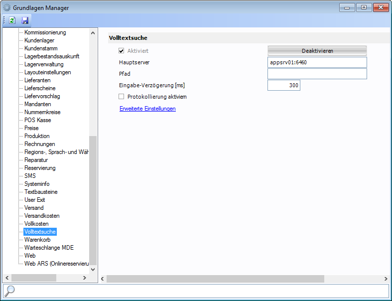 Um die Volltextsuche zu verwenden, muss diese zuvor aktiviert werden. Dies geschieht mittels Fenster Grundlagen Manager (siehe Abbildung unterhalb).