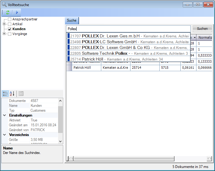 Die Suche erfolgt auf Grundlage von Suchindizes, welche für jeden Datensatz auf dem Dateisystem abgelegt werden. Dadurch muss beim Aufbau der Vorschlagsliste auch kein Zugriff auf die Datenbank durchgeführt werden. Die Datenfelder, welche unter anderem berücksichtigt werden sind für Kunden standardmäßig Name1, Name2, E-Mail-Adresse, Postleitzahl, Ort, Suchbezeichnung und Kundennummer. Für Ansprechpartner sind es Nachname, Vorname, E-Mail-Adresse, Postleitzahl, Ort und Suchbezeichnung.