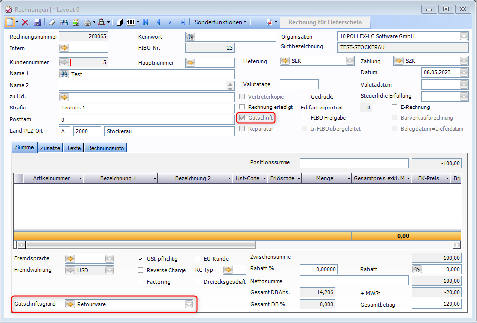 Wird nun auf Speichern geklickt, wird aus der Rechnung eine Gutschrift erstellt. Im Rechnungskopfteil wird damit auch die Checkbox "Gutschrift" aktiviert.