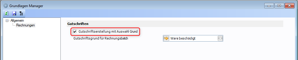 Ist im Grundlagenmanager die Einstellung "Gutschriftserstellung mit Auswahl Grund" aktiviert, muss im Rechnungskopfteil ein Gutschriftsgrund angegeben werden.