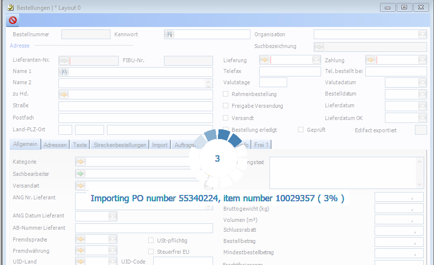 Sofern die Lieferantennummer, die Bestellnummer, das Datum, Rahmen, Zahlungsbedingung und Lieferbedingung NICHT voneinander abweichen wird für aufeinanderfolgende Zeilen eine Bestellung angelegt. Sobald eine folgende Zeile eine Abweichung aufweist wird eine neue Bestellung gemacht.