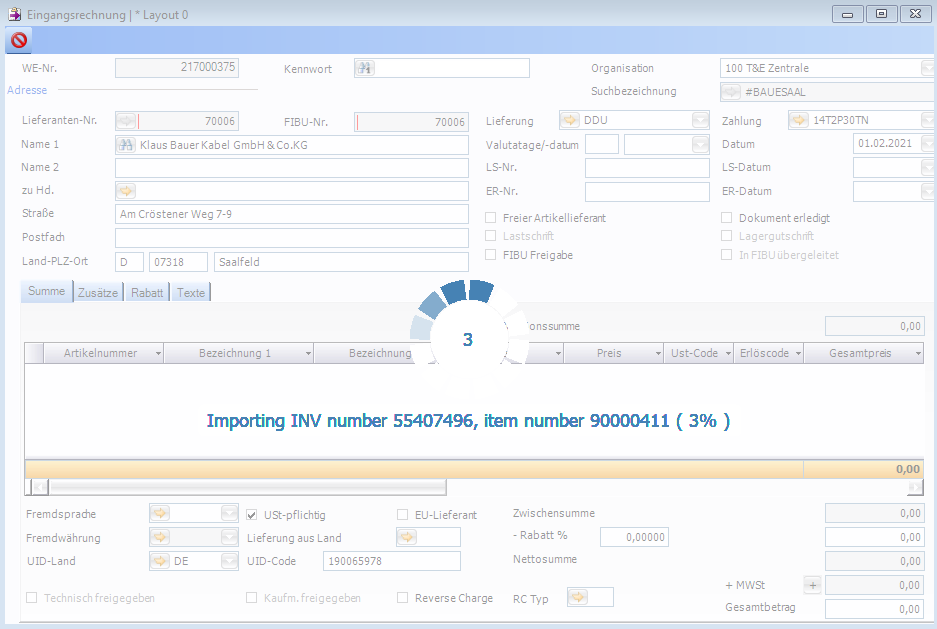 Mit dieser Funktion können aus einer CSV-Datei Eingangsrechnungen inklusive der Eingangsrechnungspositionen importiert werden.