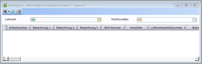 Im Fenster "Datenexport - Export mehrstufige Sonderpreise Einkauf" können Sie entweder nach Lieferant, nach Multikondition oder direkt per SQL die gewünschten Daten anzeigen lassen.