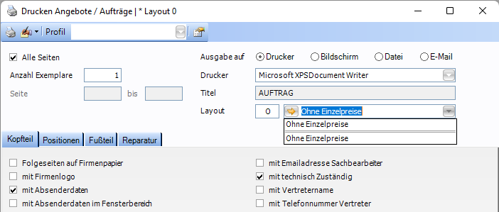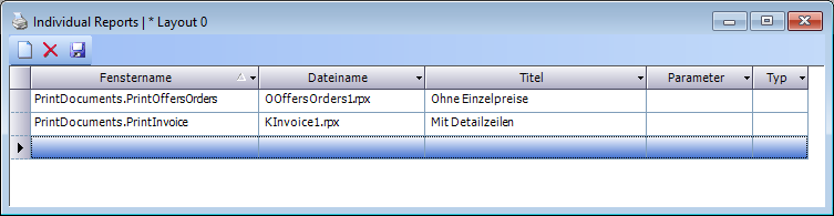 Hat ein Report KEINE Parameter im Fenster Individual Reports definiert, so wird automatisch der erste Buchstabe der Bezeichnung des Individual Reports in das Feld "Layout" übernommen und die Befüllung des Reports wird mit den Standard-Funktionen des jeweiligen Druckfensters vorgenommen.