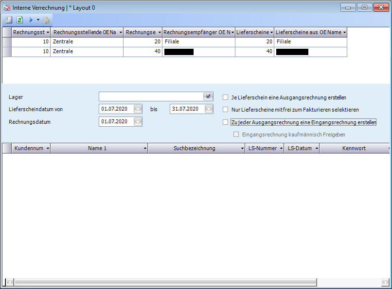 Es werden nur die noch nicht intern verrechnete Lieferscheine von Kunden welche in den organisatorischen Einheiten eingetragen sind zur Auswahl gebracht.