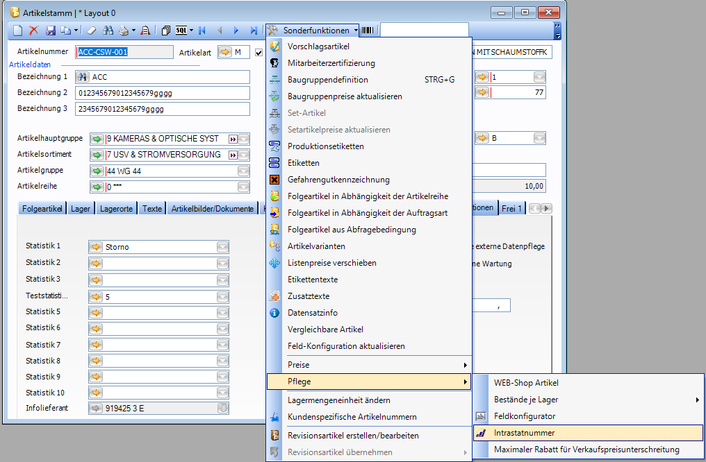 Für jeden Artikel ist eine Intrastatnummer (8-stellig) einzugeben. Unter Stammdaten - Artikelstamm - Artikelstammdaten - Sonderfunktionen - Pflege - Intrastatnummer.