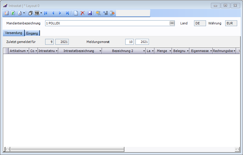 Intrastat Meldung | In Intrastat Meldung wird der Meldungstyp, der Meldungsmonat und die Meldungsrichtung (Versendung/Eingang) angezeigt. |