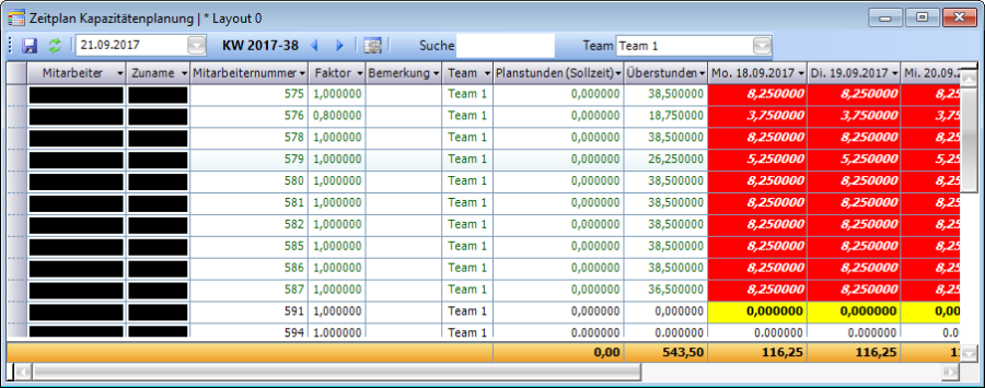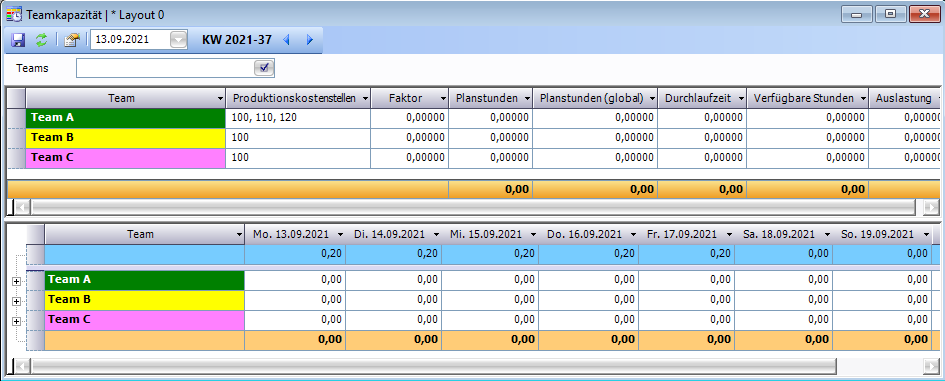 Das Fenster Teamkapazität bietet einen Überblick über die Kapazitäten der einzelnen Teams. Es dient vorranging zur Anzeige der Daten und bietet nur wenig Eingabemöglichkeiten.
