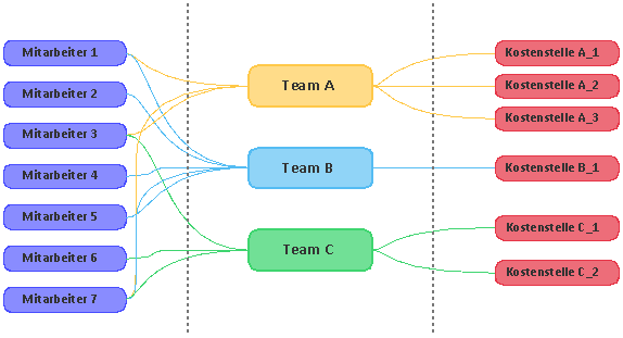 Zentrum der Kapazitätenplanung sind Teams. Diesen Teams sind verschiedene Mitarbeiter mit einem Faktor - abhängig vom Kalendertag - zugeordnet. Dies bedeutet, dass ein Mitarbeiter an einem bestimmten Datum zu 100 % bei Team A ist, am nächsten Tag aber nur mehr zu 40 % bei Team A und zu 60 % bei Team B.