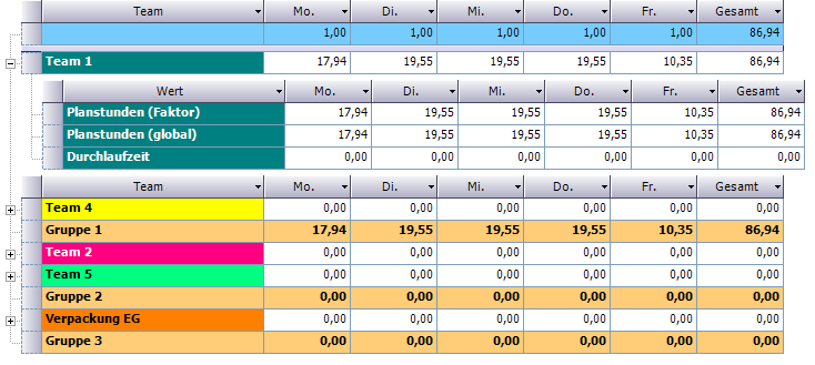 Unterhalb der Zeile mit den Faktoren folgen die einzelnen Teams, getrennt durch Summenzeilen der Gruppierungen. Die Sortierung der Teams erfolgt zuerst nach den Gruppierungen und anschließend nach dem nach den Namen der Teams der Gruppierung.