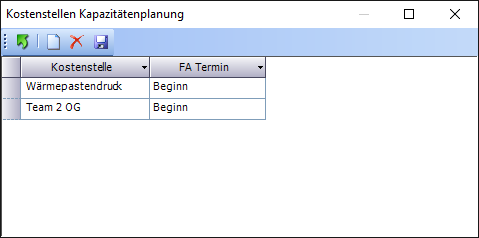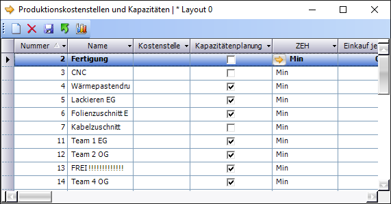 - Kostenstellen: Im Fenster Produktionskostenstellen (Grundlagen – Produktion – Produktionskostenstellen) muss für die einzelnen Kostenstellen die Eigenschaft Kapazitätenplanung gesetzt werden. Ansonsten können diese nicht verwendet werden.