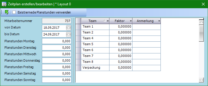 Das Fenster Zeitplan erstellen/bearbeiten bietet die Möglichkeit zur Eingabe von Planstunden und Zuordnungen zu Teams für einen bestimmten Zeitraum. Der Aufruf erfolgt für einen bestimmten Mitarbeiter.