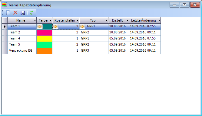 Im Fenster Teams Kapazitätenplanung erfolgen die Erfassung von Teams und die Zuordnung der Produktionskostenstellen zu diesen Teams.