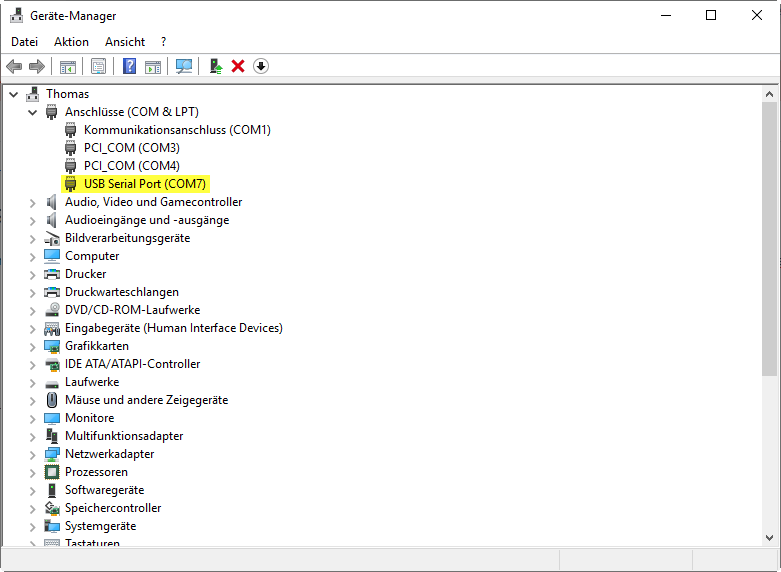 - In der Kategorie "Anschlüsse (COM & LPT)" finden Sie wie im nachfolgenden Bild ersichtlich den zugeordneten COM-Port