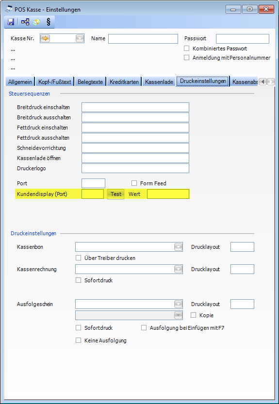 Diesen COM-Port müssen Sie nun im Pollex-LC TaskCenter im Fenster POS Kasse - Einstellungen (Zusatzprogramme - POS Kasse - POS Kasse-Einstellungen) auf der Karteikarte Druckeinstellungen im Feld Kundendisplay (Port) hinterlegen (z.B. COM7). Mithilfe des Buttons Test können Sie sich den Wert im Feld Wert am Display anzeigen lassen. Erscheint der Wert nicht am Display, vergewissern Sie sich bitte, dass der richtige COM-Port eingetragen ist und das Gerät eingesteckt ist.