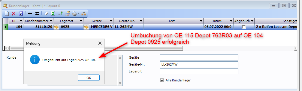 Die Funktion ändert alle Datensätze der Kundenlager Kartei und der zugehörigen Historydaten mit aktueller OE und Lagerort auf die ausgewählte OE + Lagerort.