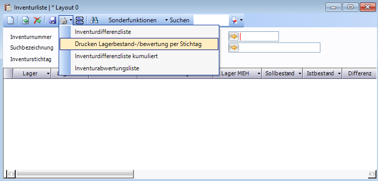 Wird eine Lagerbestands- /bewertung per Stichtag benötigt ist dies über das Fenster Inventurliste zu drucken.