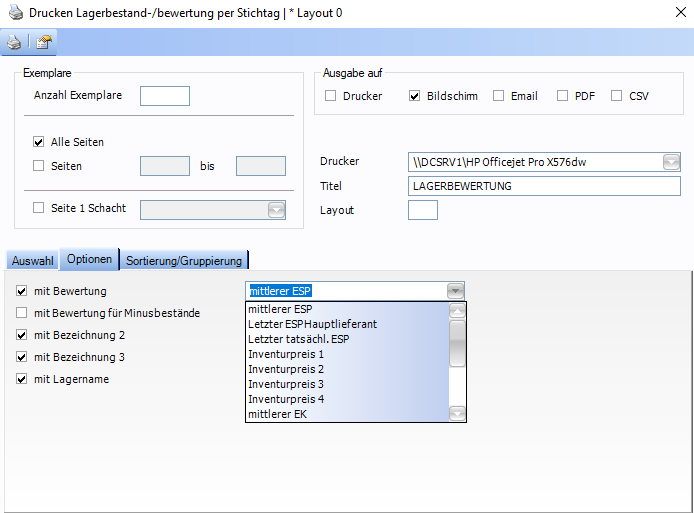 Über das Druckensymbol - Drucken Lagerbestand-/bewertung per Stichtag öffnet sich das Druckdialog-Fenster.