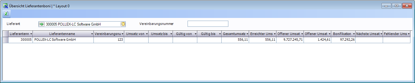 Anschließend können im Fenster Übersicht Lieferantenboni die zu den gepflegten Vereinbarungen bereits erzielten Umsätze angezeigt werden. Ebenso können dort Informationen zu Gutschriftshöhen (erreichte Bonifikation) ermittelt werden.