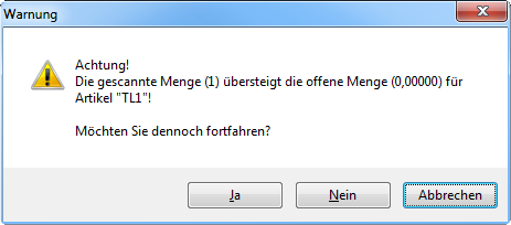 In dieser Variante ist ebenfalls der Artikel „TL1" sowohl als Einzelartikel als auch als Set-Bestandteil beinhaltet. Bei dieser Variante ist es so, dass wenn das Set nicht erweitert ist (das heißt die Set-Bestandteile nicht angezeigt werden) auf den Einzelartikel gebucht wird. Wenn das Set nicht erweitert ist und es werden mehr Stück gescannt, als die Einzelposition aufweist, dann erscheint eine Meldung, ob die Einzelposition überliefert werden soll - es wird nicht automatisch auf das Set-Bestandteil gebucht.