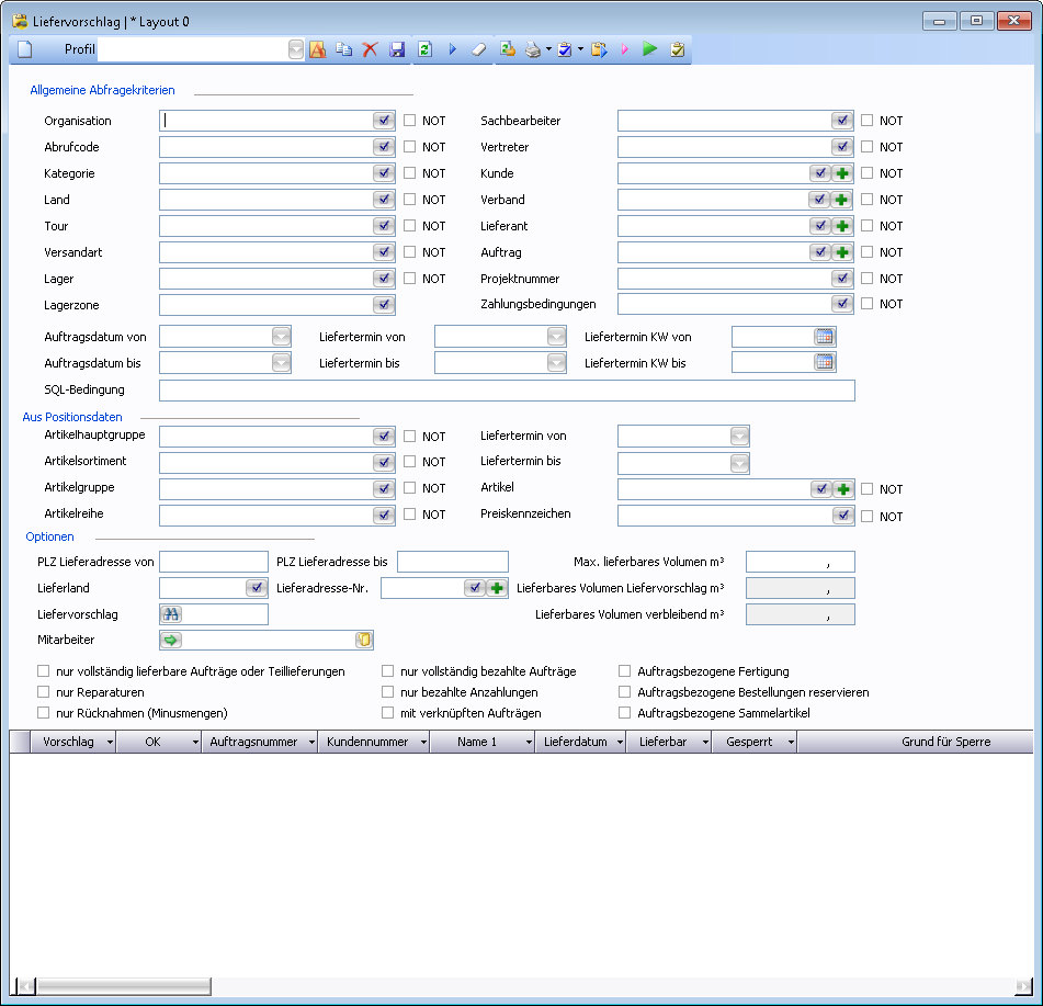 Auswahl von lieferbaren Aufträgen nach verschiedenen Kriterien. (z.B. Kunden/Verbände, PLZ, Liefertermine, Abrufcodes)