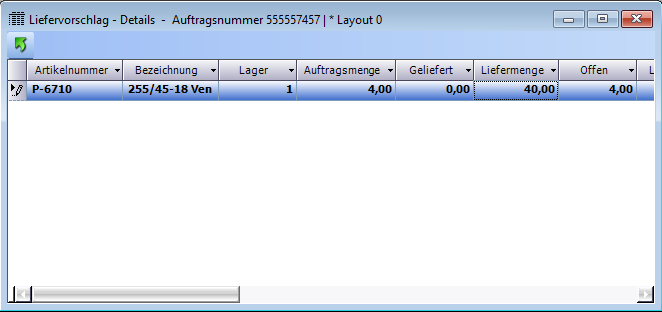 Im Feld Liefervorschlag wird die Nummer des neuen Liefervorschlags angezeigt und im Tabellenteil werden die dem Liefervorschlag zugeordneten Aufträge angezeigt.