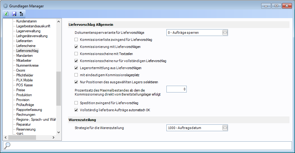 Vollständig lieferbare Aufträge automatisch OK | Wenn aktiviert, dann wird bei Erstellung eines Liefervorschlags, das Feld "Ok" automatisch aktiviert, wenn dieser vollständig lieferbar ist - andernfalls muss dies manuell bestätigt werden. |